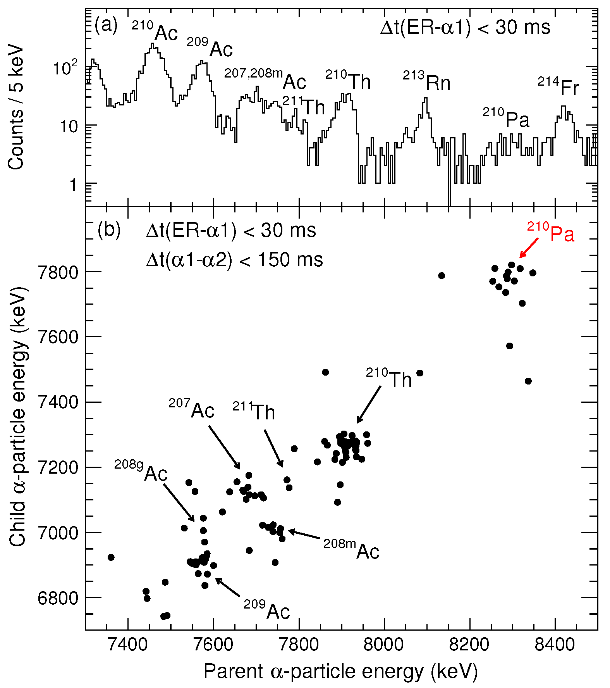 研究团队利用中国超重元素研究加速器装置(CAFE2)提供的钙-40束流轰击镥-175靶,通过熔合蒸发反应,在充气反冲核谱仪(SHANS2)上成功合成了质子滴线外新核素镤-210,并成功测量了该核素的α衰变能量和半衰期。
